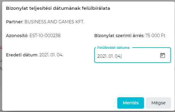 A Kontrolling Modulvezető felülbírálhatja a bevételi bizonylat teljesítés dátumát a bizonylat hárompontos menüjéből indítva.